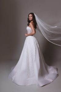Fully embroidered dress with removable satin overskirt and bolero; Mermaid skirt.