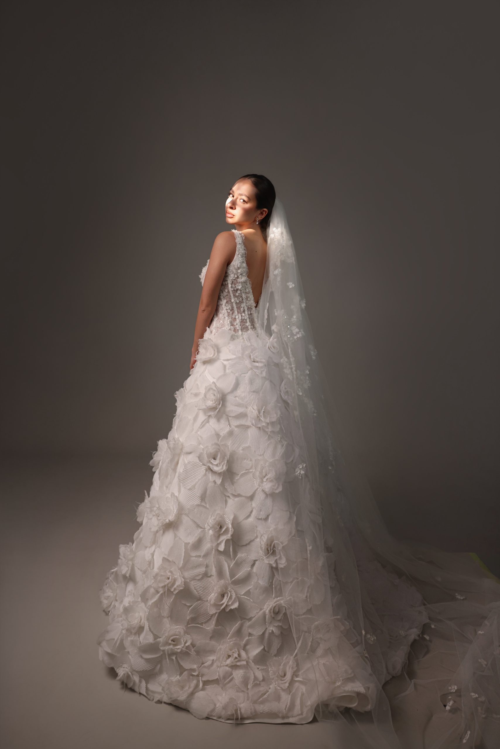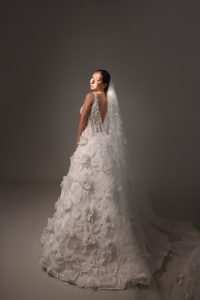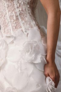Full 3D lace dress with V-cut neckline; A-cut skirt.