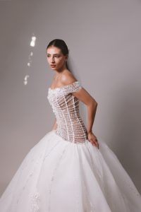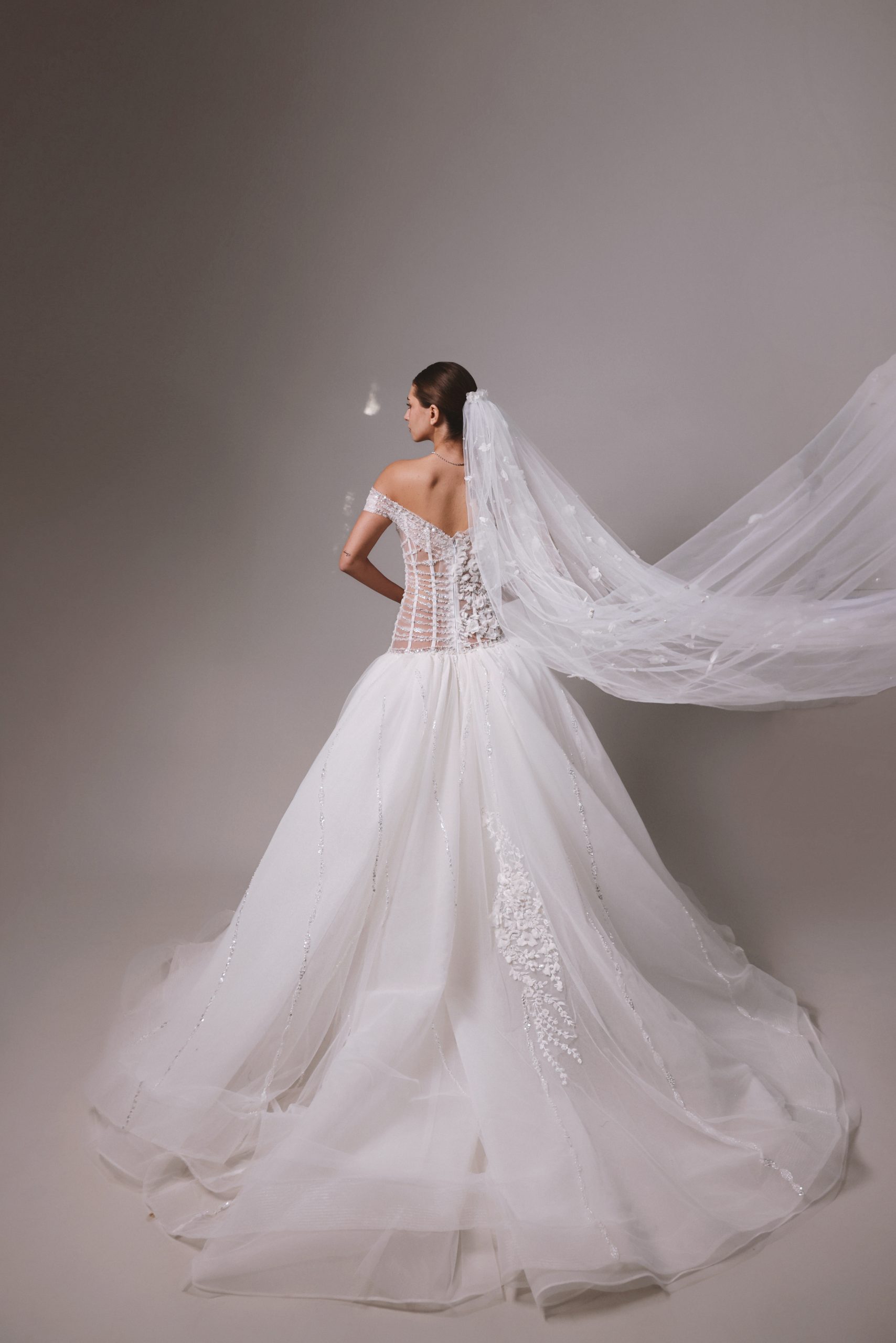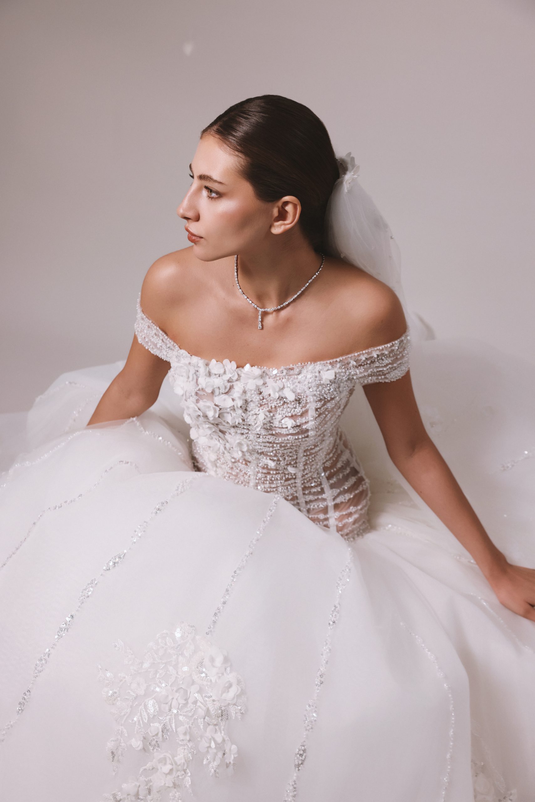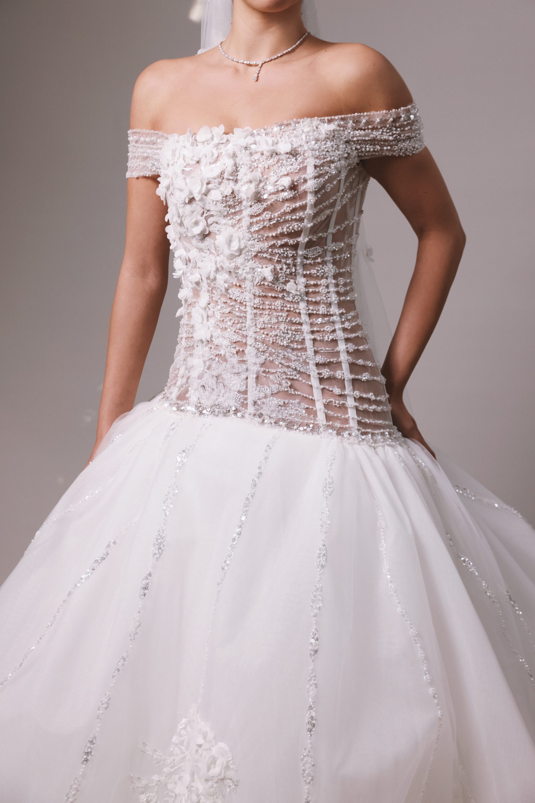 Fully embroidered off-shoulder dress with a ribbon in the back; Mermaid skirt.