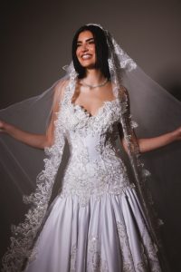 Sequins and satin dress with sweetheart neckline; Ballgown skirt.