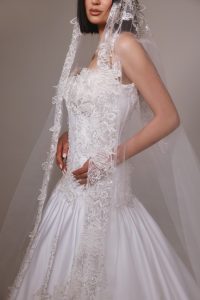 Tulle and embroidered lace nude dress with cape; A-line skirt.