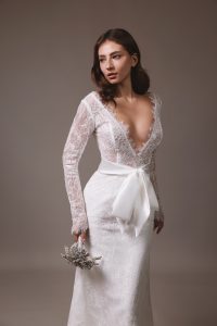 Off-shoulder dress with sleeves; Mermaid skirt.