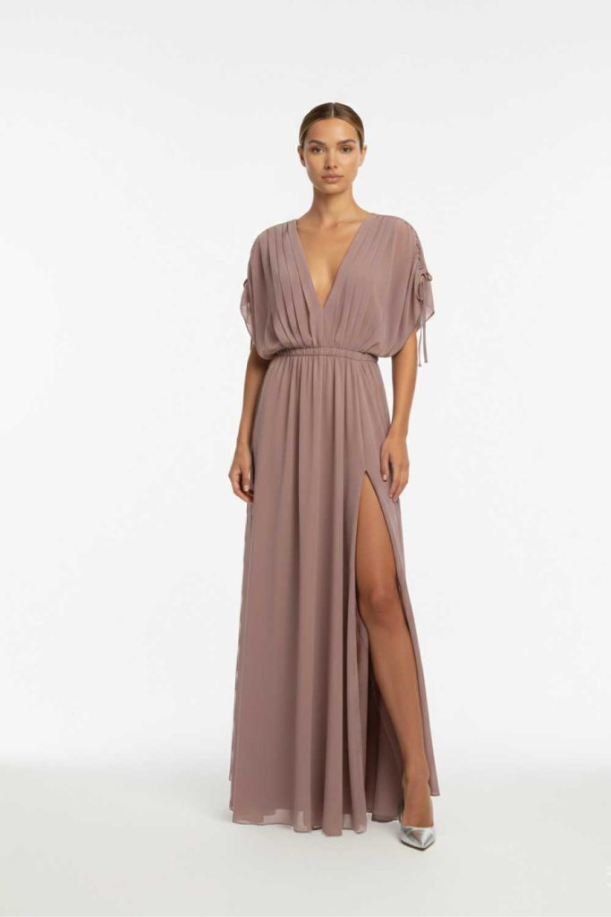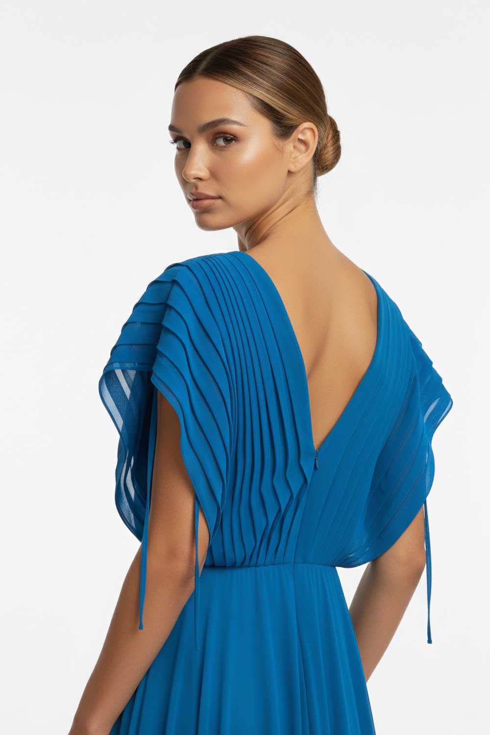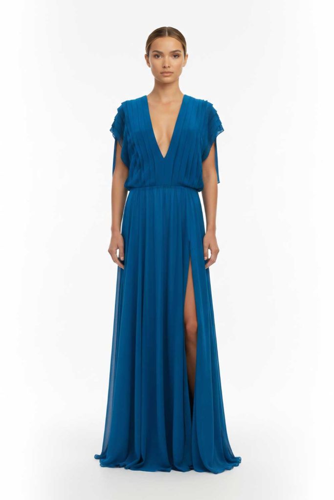 Fitted floor-length pleated dress.