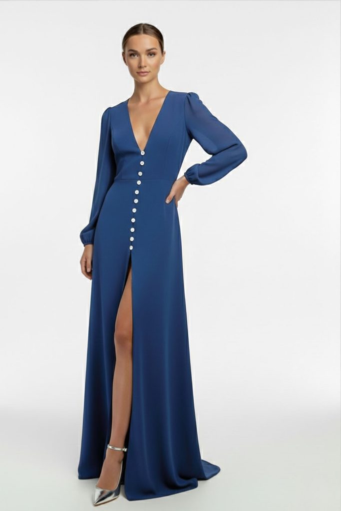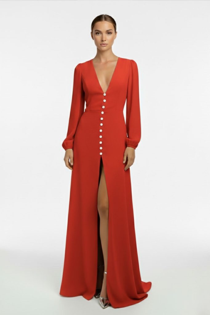 Fitted floor-length pleated dress.