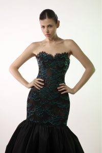 This exquisite trumpet dress beautifully blends romantic elegance with timeless sophistication. The lace bodice features intricate floral patterns, adding delicate texture and femininity, while the sweetheart neckline enhances the décolletage, offering a soft, flattering shape that exudes grace and allure. The voluminous taffeta skirt flows from the thighs, creating a striking trumpet silhouette that hugs the body before flaring out with dramatic flair. The rich taffeta fabric catches the light with its luxurious sheen, elevating the entire design with its opulence and structure.