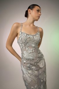 This enchanting fitted dress is a poetic fusion of femininity and modern elegance. Crafted from delicate floral lace, it hugs the figure with sculptural precision, creating a silhouette that is both refined and sensual. Scattered throughout the dress are hand-applied 3D floral appliqués, petal-soft blooms that seem to float atop the lace, adding depth, movement, and a dreamy textural contrast.