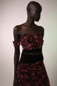 This stunning two-piece set is the epitome of bold elegance and timeless beauty. The off-shoulder sweetheart neckline corset hugs the body with precision, accentuating the waist and décolletage while offering a sophisticated yet seductive design. The corset is fully embroidered with intricate patterns that add a layer of artistry and refinement, creating a visually captivating focal point. The skirt, designed to flow gracefully from the hips, features a daring high slit that adds an element of drama and allure. The full embroidery on the skirt mirrors the corset’s detailed craftsmanship, ensuring a harmonious and luxurious look from top to bottom.
