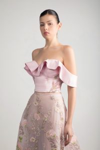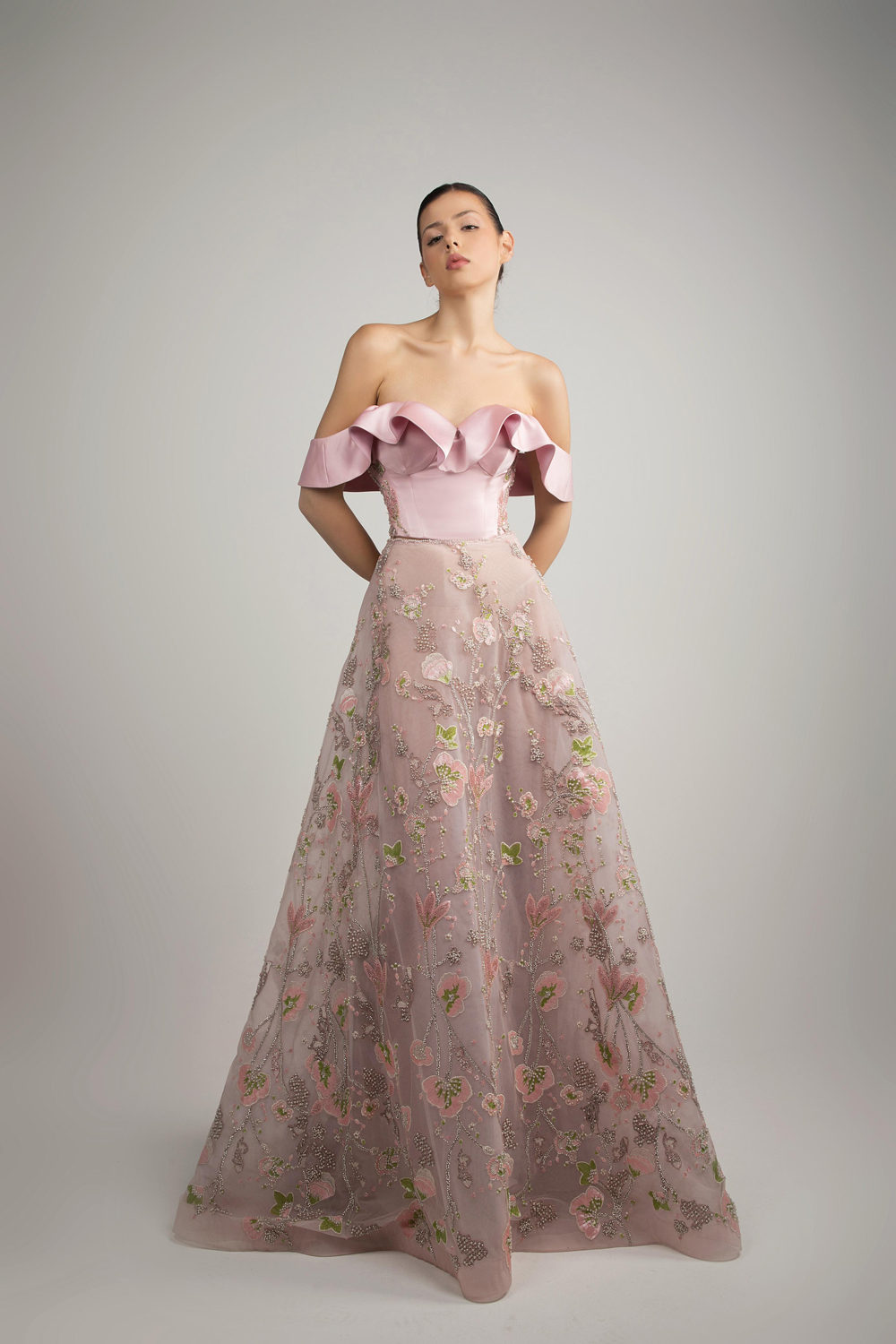 Romantic elegance meets modern sophistication in this exquisite two-piece set. The off-shoulder satin corset steals the spotlight with soft, cascading ruffles that frame the neckline in graceful movement. Designed to sculpt and flatter, the corset features delicate side embroidery. Paired with a voluminous, fully embroidered skirt, the ensemble balances structure and softness. Every inch of the skirt is adorned with intricate threadwork, creating a rich tapestry of texture and elegance that flows effortlessly with every step. Together, the set captures a sense of timeless femininity with a fresh, contemporary twist.